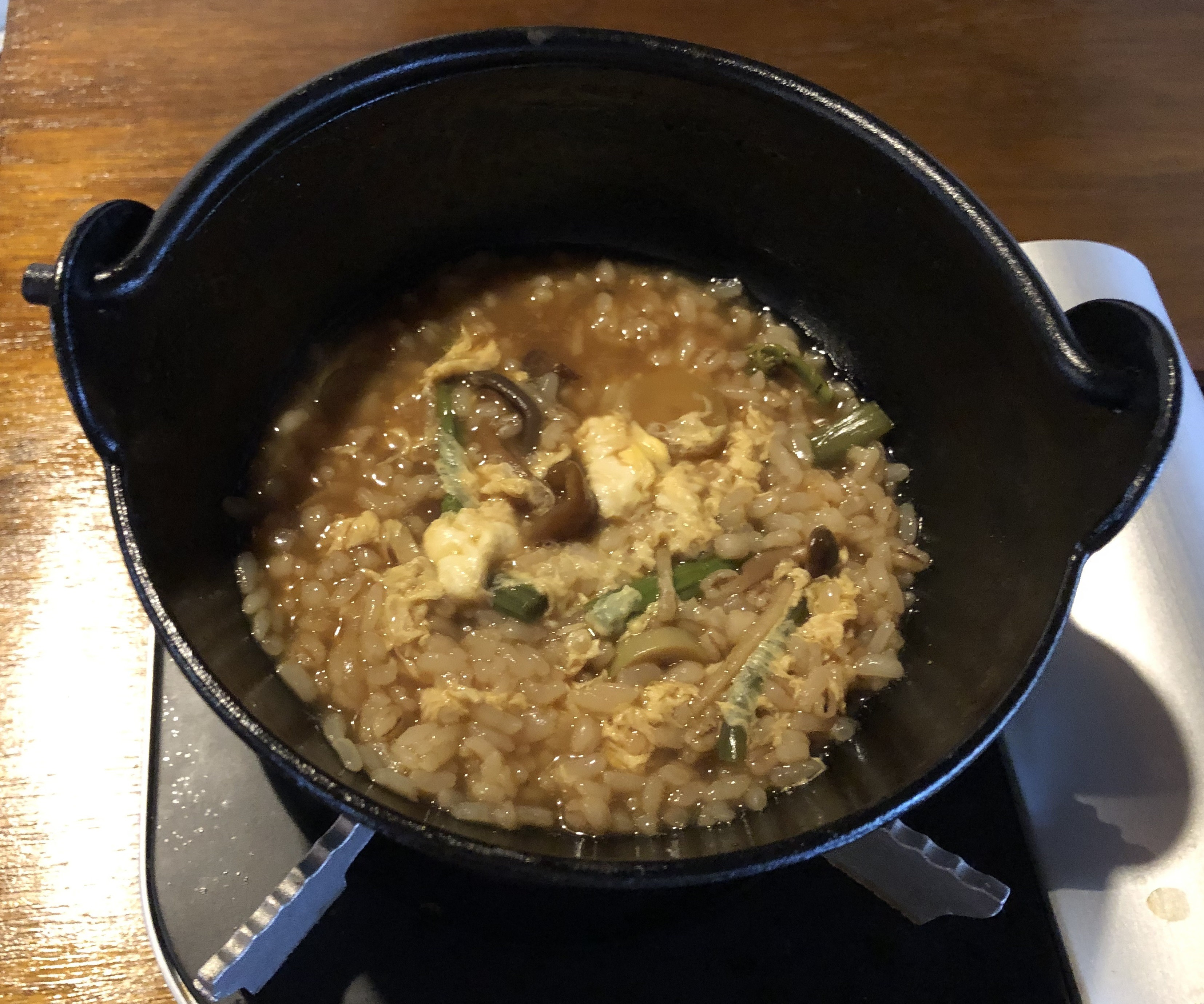 お鍋の中には山菜・きのこ・鴨肉など良いお出汁が出る具材がいっぱい!身体が温まること間違いなしです
